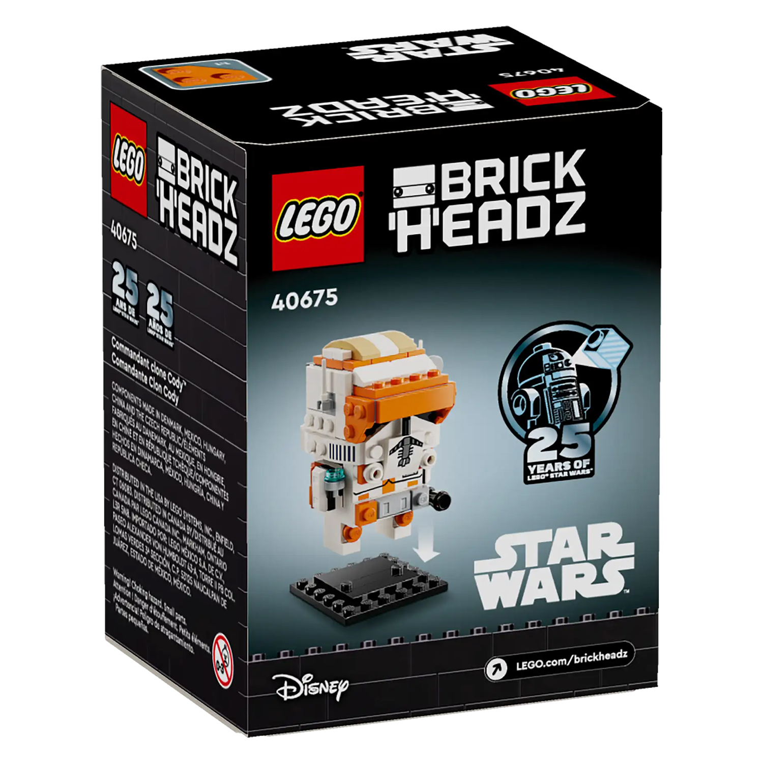 Roep herinneringen op aan een spannende Star Wars: Revenge of the Sith scène met deze LEGO® BrickHeadz™ Clone Commander Cody (40675) figuur. Dit bouw- en displaymodel is een topcadeau voor kinderen vanaf 10 jaar en heeft veel authentieke details, waaronder zijn Phase 2-pantser en een holoprotector, zoals degene waarop hij Bevel 66 van kanselier Palpatine ontving. De bouwbare LEGO speelgoedfiguur van Commander Cody wordt geleverd met een bouwplaat om een opvallend LEGO Star Wars™ display ter erevan het 25-jarig jubileum compleet te maken.