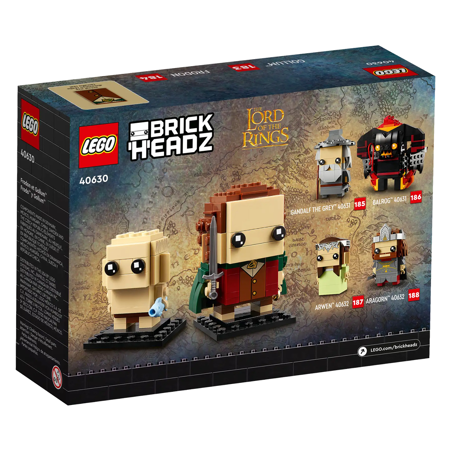 Fans van de The Lord of the Rings™ saga zullen weg zijn van deze LEGO® BrickHeadz™ Frodo™ & Gollem™ verzamelset (40630). Frodo is een volledige LEGO BrickHeadz figuur met een mantel van LEGO stenen, een ring en een zwaard. De Gollem figuur is kleiner om de verhouding tussen de twee personages weer te geven en houdt een vis vast – zijn favoriete eten. Dit bouwbare displaymodel is een geweldig cadeau voor fans van The Lord of the Rings, LEGO bouwers en LEGO BrickHeadz verzamelaars.